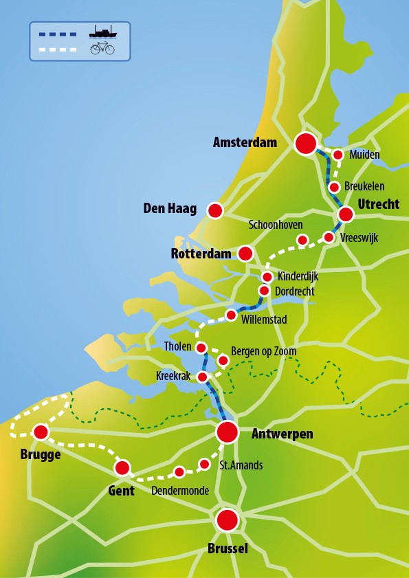 During the day you will cycle to world famous destinations such as Amsterdam, Dordrecht, Antwerp, Ghent and Bruges, while at night you will relax in the comfort of your floating hotel.